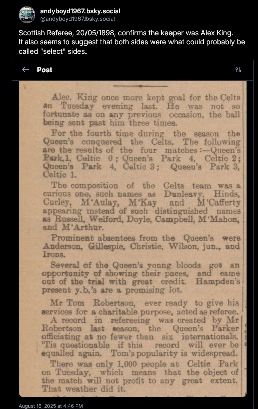 • The goalkeeper WAS Alick King and it certainly was a Celtic reserve line up and QP also brought in some fringe men(being mid May, many of the amateurs were away playing cricket or tennis or on holiday or whatever). However,  has been as a first class game although possibly the contemporary Hampden committee would have considered it as unofficial as they did on numerous occasions in the 19th century. Just one man now missing – Hinds.